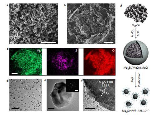 傳統(tǒng)上在惰性氣體中通過固體反應制備的微尺度Mg2Si粒子體積太大,無法在液體介質(zhì)中分散。為了獲得具有組織穿透性的可注射MS NPs,我們開發(fā)了一種在O2/Ar混合氣體環(huán)境下的特殊自推進高溫合成(SHS)方法。在這種方法中,O2可以與過量的鎂發(fā)生放熱反應,從而誘導鎂和硅發(fā)生后續(xù)的結合反應。圖2a中的掃描電子顯微鏡(SEM)圖像顯示,洗滌前的產(chǎn)品似乎含有大量微顆粒;X射線衍射圖樣分析顯示,這是Mg2Si和MgO的混合物。通過放大的SEM圖像和相應的裂紋顆粒的能量色散光譜(EDS)元素圖譜(圖2b、c),可以確認這些微顆粒具有確定的核殼形態(tài),即Mg2Si/MgO內(nèi)核位于薄薄的MgO外殼中。從眾所周知的晶界鎖定效應來看,作為環(huán)繞Mg2Si顆粒的高熔點相,MgO副產(chǎn)物可抑制其不必要的晶粒生長,而MgO外殼則可防止內(nèi)部Mg2Si氧化。對Mg2Si納米粒子進行洗滌以去除氧化鎂,然后用PVP對其進行修飾和透射電子顯微鏡(TEM)圖像(圖2d)表明,得到的MS NPs雖然形態(tài)不規(guī)則,但直徑小于100nm,且分散良好。此外,制備的MS NPs結晶良好,具有明顯的鋸齒狀邊緣(圖2e,f),這表明SHS過程非常迅速,沒有進一步的再結晶和增強生長。這種利用MgO副產(chǎn)物作為Mg2Si晶體生長抑制劑的特殊SHS策略(圖2g)使非聚集MS NPs的合成成為一種可注射的DOA。