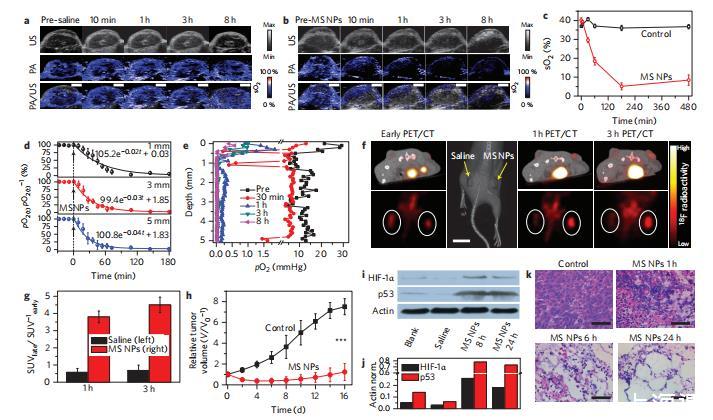 此外,還進(jìn)行了體內(nèi)18F-MISOPET/CT成像,以評(píng)估瘤內(nèi)缺氧水平和非腫瘤區(qū)域的潛在誤缺氧。與PA/US結(jié)果一致,早期PET/CT圖像顯示治療前的缺氧水平相當(dāng),這證實(shí)了雙側(cè)腫瘤在這一階段的輕微缺氧性質(zhì)(圖5f)。盡管18F-MISO放射性在體內(nèi)不可避免地會(huì)發(fā)生核衰變和新陳代謝損失,但在注射MSNP一小時(shí)后的PET/CT圖像中,仍觀察到18F-MISO攝取大大增強(qiáng)(圖5f、g)。更令人興奮的是,在三小時(shí)后的PET/CT圖像中,發(fā)現(xiàn)缺氧區(qū)域覆蓋了整個(gè)腫瘤區(qū)域,而腫瘤周圍的正常組織中沒有發(fā)現(xiàn)任何新產(chǎn)生的缺氧區(qū)域。作為陰性對(duì)照,皮下注射MS NPs后,正常組織的血液sO2和氧張力沒有明顯變化,這進(jìn)一步證實(shí)了MS NPs在體內(nèi)的酸性敏感性和特異性,從而消除了對(duì)正常pH值的非癌組織的潛在副作用的擔(dān)憂。