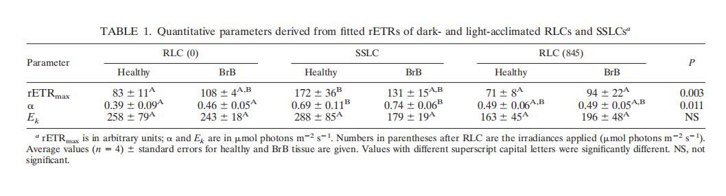 a rETRmax單位為任意單位;α和Ek單位為μmol光子m?2s?1。RLC后括號中的數(shù)字是應(yīng)用的輻照度(μmol光子m?2s?1)。給出健康和BrB組織的平均值(n=4)±標準誤。具有不同上標大寫字母的值顯著不同。NS,不顯著。