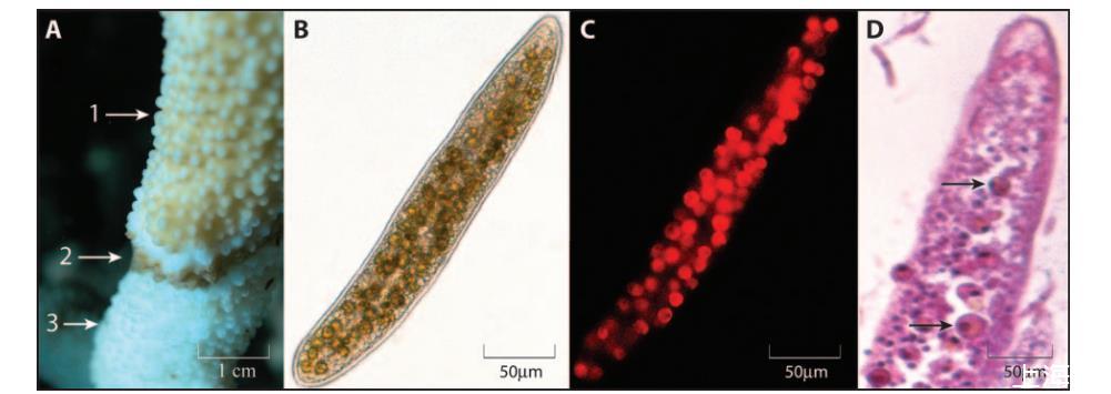 BrB的野外和顯微鏡觀察。BrB在野外表現(xiàn)出獨特的宏觀癥狀,這些癥狀源于纖毛蟲在珊瑚樣品外部滑動并進入珊瑚蟲的共體腔和腔體。纖毛蟲的光學顯微鏡分析表明纖毛蟲體內(nèi)積累了完整的蟲黃藻。攝入的蟲黃藻保持強烈的局部葉綠素自發(fā)熒光,表明葉綠體完整且具有潛在的光合作用能力。此外,取樣的褐帶物質(zhì)的組織學橫截面顯示,纖毛蟲含有完整的蟲黃藻,這些蟲黃藻沒有被食物液泡包圍。