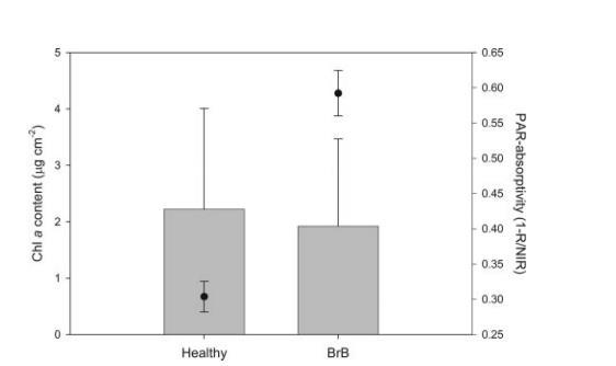 健康組織的PAR吸收率測量值顯著低于褐帶組織。然而,健康組織的葉綠素a含量與褐帶組織中發(fā)現(xiàn)的含量沒有顯著差異。這表明色素在健康組織和褐帶之間的分布不同。