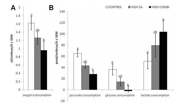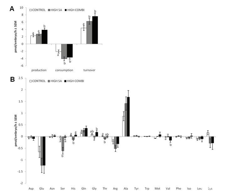 個(gè)別氨基酸的譜圖顯示,與對(duì)照和HIGH COMBI胚胎相比,含有來(lái)自HIGH SA卵母細(xì)胞的囊胚的培養(yǎng)介質(zhì)中絲氨酸、組氨酸和蘇氨酸的濃度顯著降低,而纈氨酸的消耗由HIGH COMBI囊胚更高。含有來(lái)自HIGH SA暴露卵母細(xì)胞的囊胚的介質(zhì)中甘氨酸濃度降低,表明甘氨酸消耗,而對(duì)照和HIGH COMBI胚胎顯示凈甘氨酸產(chǎn)生。卡方檢驗(yàn)顯示處理組間發(fā)育階段無(wú)顯著差異。因此,發(fā)育階段可排除為可能的混淆因素。