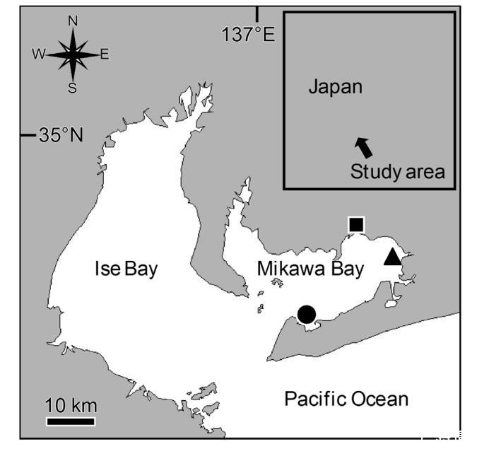 圖1. 菲律賓蛤仔(Ruditapes philippinarum)成熟個體(田原市沿海;實心圓)和稚貝(六條潮灘;實心三角形)的采樣點位置。人工授精和實驗室實驗在愛知縣漁業研究所(實心正方形)進行。