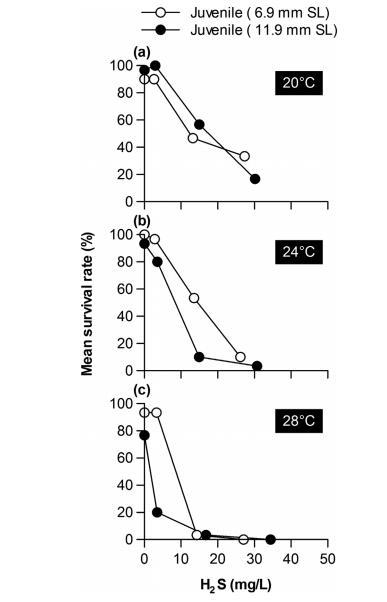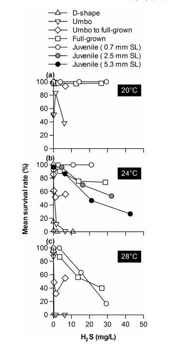 圖7. 日本三河灣六條潮灘野生菲律賓蛤仔(Ruditapes philippinarum)幼體進(jìn)行24小時(shí)暴露實(shí)驗(yàn)后,H?S濃度與平均存活率關(guān)系的個(gè)體發(fā)育變化。