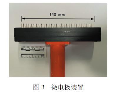 本次試驗中的高密度電法測量,采用WGMD-9超級高密度電法儀作為采集系統,其由信號發射和采集主機WDA-1B和多路電極轉換器WDZJ-4組成。采用自行設計的微電極陣列作為測試電極,如圖3所示。微電極陣列由30個1 mm粗的銅針電極以5 mm間距排列而成,電極陣列全長150 mm。各電極與導電基座通過彈簧連接,有8 mm的伸縮空間,以保證電極與試樣表面密切接觸,消除因表面凹凸不平產生的測試誤差。由于試驗現象存在對稱性,故設置微電極的測深為25 mm。