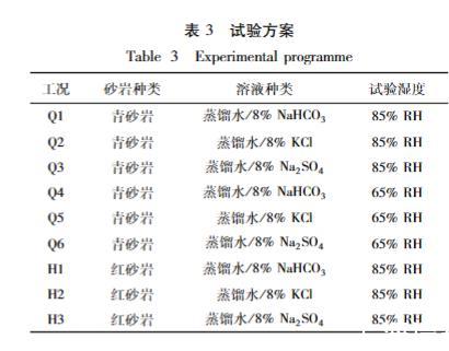 試驗取樣地區年平均相對濕度為70%~80%,年平均溫度約為20℃。因此,控制試驗箱內溫度為20℃。借由飽和鹽溶液對水蒸氣的動態調節特性,控制試驗箱濕度分別為65%RH和85%RH。依據大足石刻所在區域的地質條件和水質測試結果,結合《天然石材試驗方法:毛細吸水系數的測定》(GB/T 9966.13)(中華人民共和國國家標準編寫組,2021)和《天然石材試驗方法:鹽結晶強度的測定》(GB/T 9966.17)(中華人民共和國國家標準編寫組,2021),選用青砂巖和紅砂巖,人工制備不同鹽溶液,研究孔隙結構、孔隙溶液、干濕循環和相對濕度對毛細運移和電阻率分布特性的影響。試驗方案如表3所示,在正式試驗前進行一次蒸餾水試驗作為對照,相同試驗條件開展3次平行重復。