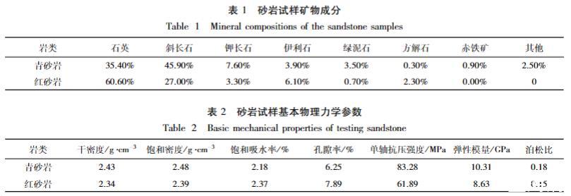 試驗選取大足石刻周邊同一侏羅系地層的青砂巖和紅砂巖作為巖樣,XRD測試可得礦物成分主要由石英,長石,伊利石組成,如表1所示。基本物理力學參數如表2所示。在巖樣的加工過程中,首先將采集的原巖切割成30個立方體,再進行打磨,將巖樣制成50 mm×50 mm×50 mm的立方體試樣,并在其頂部中心用環氧樹脂膠結劑黏接金屬掛鉤以便試驗中量測質量的變化。