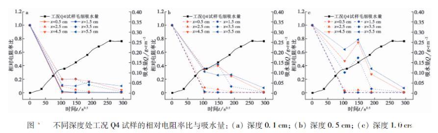 圖10不同深度處工況Q4試樣的相對電阻率比與吸水量:(a)深度0.1 cm;(b)深度0.5 cm;(c)深度1.0 cm