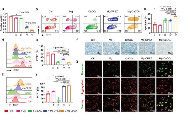 圖3、Mg-CaCO3抗腫瘤效果的體外評估。a)4T1細胞在24小時內(nèi)的相對細胞存活率(n=4)。b,c)流式細胞術(shù)分析(b)及相應定量分析(c)通過Annexin V/PI染色4T1細胞凋亡范圍(n=3)。d,e)流式細胞術(shù)測定(d)及BCECF AM探針對4T1細胞pH水平的定量分析(n=3)。f)MB染色4T1細胞氫生成的定性分析。比例桿=50微米。g)對4T1細胞進行不同處理后的熒光顯微鏡圖像,然后用JC-1染料染色。比例桿=25微米。h,i)通過DCFH-DA探針對4T1細胞細胞內(nèi)ROS水平(DCF細胞比率)進行流式細胞術(shù)分析(h)及相應定量分析(i)(n=3)。組別:I組:Ctrl,II:Mg,III:CaCO,IV:Mg-OPSZ,V:Mg-CaCO。統(tǒng)計顯著性通過雙尾學生t檢驗計算。p<0.05,p<0.01,p<0.001。顯示平均值和標準差。