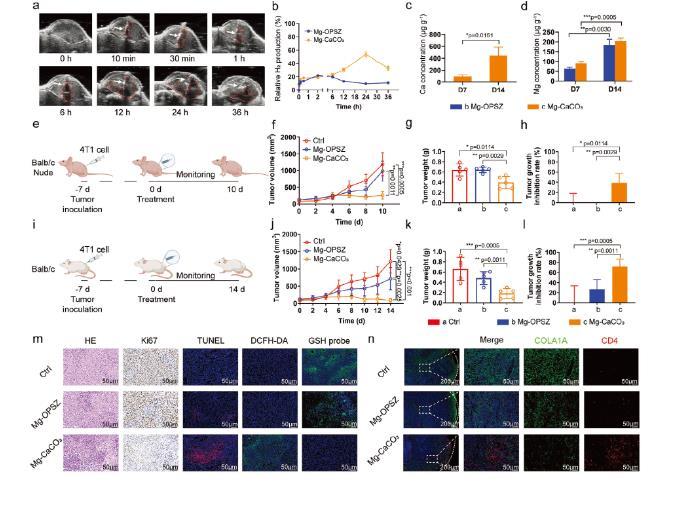 特別是Cxcl1和Cxcl12的表達被抑制,這兩種因子與CD4?T細胞的免疫抑制表型相關(guān)。在與CD4?T細胞的共培養(yǎng)模型中,Mg-CaCO?處理的CAFs顯著降低了Foxp3的表達和Treg比例,同時增強了免疫激活標志物的表達。在體內(nèi)實驗中,研究團隊通過超聲成像技術(shù)監(jiān)測了Mg-CaCO?在腫瘤內(nèi)的氫氣生成能力,并通過電感耦合等離子體質(zhì)譜(ICP-MS)檢測了降解產(chǎn)物。結(jié)果顯示,Mg-CaCO?在腫瘤內(nèi)具有高效穩(wěn)定的氫氣生成能力,且降解產(chǎn)物不會影響全身的鈣和鎂平衡。在Balb/c裸鼠和免疫健全的Balb/c小鼠中,Mg-CaCO?顯著抑制了4T1腫瘤的生長,并通過重塑CAFs表型促進了CD4?T細胞的浸潤。