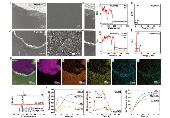 圖2、Mg-CaCO3棒的制備與表征。a-d)a)Mg-Opsz棒和b)Mg-CaCO3棒的代表性SEM圖像。比例條:100和1微米,如所示。b,e)局部SEM圖像及(b)Mg-Opsz棒和e)Mg-CaCO3rods中元素的對應分布。c-f)c)Mg-OPSZ棒和f)Mg-CaCO3rods的EDS光譜。g)制備后Mg-CaCO3rods的STEM圖像,顯示Mg、Ca、Si、O和C的元素分布。比例條=100微米。(h)Mg棒、Mg-CaCO棒和納米方解石的XRD圖譜。i)通過氫電極測量PBS中Mg、Mg-OPSZ或Mg-CaCO棒(pH 7.4和pH 6.8)的氫生成。j)通過ICP-MS測量PBS溶液中Mg、Mg-OPSZ或Mg-CaCO3棒的Mg釋放曲線。