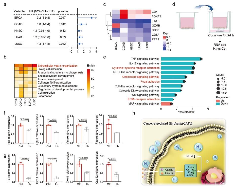 圖1、泛癌CAFs的畫像及氫處理反轉(zhuǎn)CAF表型。a)不同TCGA數(shù)據(jù)集中高低CAF特征表達組的總體生存率(OS)。b)熱圖顯示不同TCGA數(shù)據(jù)集中CAF高組上調(diào)基因的富集通路。c)熱圖顯示不同TCGA數(shù)據(jù)集中CAF高組和低CAF組的關(guān)鍵免疫基因表達折疊變化。d)使用transwell體外氫處理模型示意圖。e)條形圖顯示H組DEGs通路富集,與Ctrl組相比。f,g)通過qPCR分析CAFs中CAF中CAF的MRNA水平,包括(H)或未(Ctrl)氫處理(n=3)。h)CAF表型逆轉(zhuǎn)氫處理機制的示意圖示。