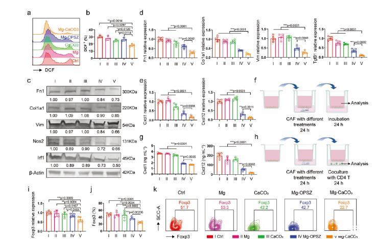 圖4、Mg-CaCO3的CAF重塑和免疫調(diào)節(jié)作用的體外評估。a,b)流式細胞術(shù)測定(a)和相應的定量分析(b)不同處理的CAF中細胞內(nèi)ROS水平(DCF細胞比率)(n=3)。c)不同處理的CAFs的CAF標記蛋白的Western blot分析。d)通過qPCR分析不同處理的CAF中CAF標志物的MRNA水平(n=5)。e)通過qPCR分析不同處理的CAF中Cxcl1和Cxcl12的mRNA水平(n=5)。f,h)使用transwell的體外共培養(yǎng)模型示意圖f)不帶和h)與CD4T細胞(用bioRender.com創(chuàng)建)。g)不同處理的CAF上清液中Cxcl1和Cxcl12水平的濃度定量(n=5)。i)通過qPCR分析與不同處理的CAF共培養(yǎng)的CD4T細胞中Foxp3的MRNA水平(n=5)。j,k)流式細胞術(shù)測定(k)和與不同處理的CAF共培養(yǎng)的CD4T細胞中Treg(Foxp3cell)的相應定量分析(j)(n=5)。組:I:Ctrl,II:Mg,III:CaCO3,IV:Mg-OPSZ,V:Mg-CaCO3。