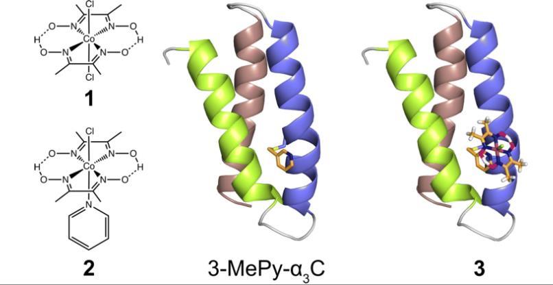 圖1、左:本研究中使用的鈷氧化肟:[Co(dmgH)2Cl2](1),和[Co(dmgH)2(py)Cl](2)。中心:基于相關蛋白系統2MP-α3 C(2MP=2-巰基酚),RSCB PDB ID 2LXY的3-MePy-α3 C(3-MePy=3-甲基吡啶)結構模型。α3腳手架中的螺旋1、2和3分別以青檸綠、藍色和灰褐色呈現。右圖:基于3-MePy-α3C的人工氫化酶模型。