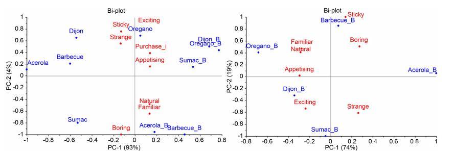 CLT外觀樣本的主要區(qū)別在于它們是預(yù)腌制還是與腌料一起放在旁邊的袋中(圖2,左圖)。這占了數(shù)據(jù)變異的93%(PC1)。預(yù)腌制樣本被評(píng)為無聊、奇怪和粘稠,而腌料放在袋中的豬排被評(píng)為興奮、開胃、自然、熟悉和購買意向得分更高。因此決定繼續(xù)研究使用袋裝腌料而非預(yù)腌制樣本。