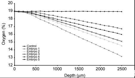 培養(yǎng)基中氧氣的溶解度(約9%鹽度和37.0°C)計(jì)算為200μmol/l。38.5°C時(shí)培養(yǎng)培養(yǎng)基中的擴(kuò)散系數(shù)同樣計(jì)算為3.37×10?? cm2/s。單個(gè)胚胎呼吸速率以nl O?/胚胎每小時(shí)(nl/h)表示。