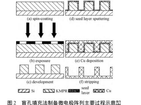 圖2盲孔填充法制備微電極陣列主要過(guò)程示意圖