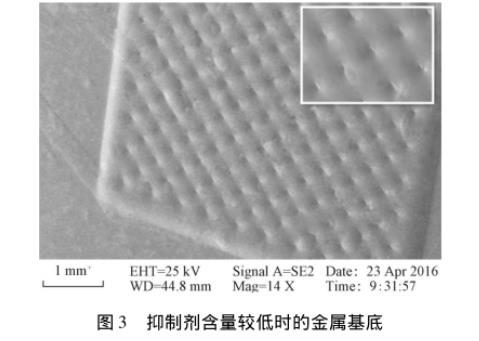 加速劑、抑制劑在電鑄液中的含量對(duì)盲孔填充和微電極陣列基板的形成有著很重要的作用,圖3為抑制劑含量較低時(shí),電鑄10 h形成的金屬基底的形貌及其局部放大圖,隨機(jī)取點(diǎn)測(cè)得對(duì)應(yīng)h=470μm,h'-h=50μm,電鑄填充率為89.3%,填充率較低時(shí)會(huì)增加后續(xù)拋光的工作量,因此,加工過(guò)程中需合理控制并根據(jù)其消耗量適當(dāng)補(bǔ)充各類添加劑。