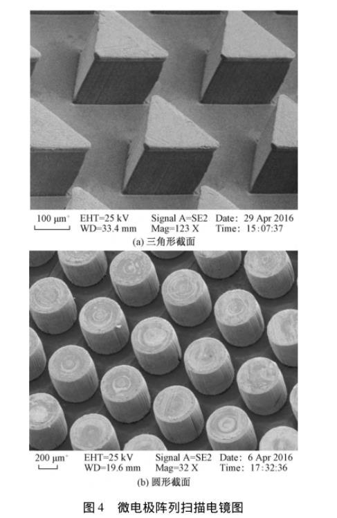 圖4是去除KMPR膠模后的微電極掃描電鏡照片。圖4(a)是截面為正三角形的陣列電極,三角形邊長(zhǎng)為200μm,中心距為353μm,高度為180μm,圖4(b)是截面為圓的陣列電極,圓直徑為200μm,中心距為400μm,高度為180μm。由于金屬基底是在電極上方形成的,所以不會(huì)出現(xiàn)電極脫落的現(xiàn)象。