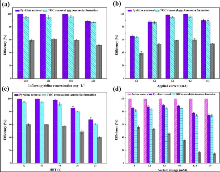 圖2. (a)吡啶濃度、(b)施加電流、(c)水力停留時(shí)間、(d)乙酸投加量對厭氧反應(yīng)器中吡啶降解、TOC去除及氨氮生成的影響