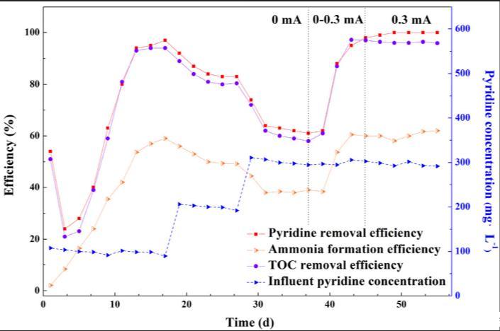 如圖2a所示,反應(yīng)器在進(jìn)水吡啶濃度300-500毫克/升范圍內(nèi)保持良好去除性能,其中幾乎100%吡啶和95% TOC(p>0.05)被去除,約60% NH4-N(p>0.05)產(chǎn)生,表明反應(yīng)器性能變化不顯著。然而,當(dāng)進(jìn)水吡啶濃度增加至600毫克/升時(shí),吡啶去除效率顯著從100.0%降低至89.3±1.4%(p=0.009),且NH4-N形成效率降低10%(p=0.012)。類似現(xiàn)象也在先前研究中觀察到,這可歸因于更高吡啶濃度下的更高頑固性和毒性。應(yīng)指出,原始工業(yè)廢水中吡啶濃度通常在20-500毫克/升范圍內(nèi)。電刺激厭氧系統(tǒng)中最大吡啶去除率遠(yuǎn)高于2.28摩爾/立方米·天,高于傳統(tǒng)缺氧或厭氧系統(tǒng)。例如,存在電子受體即NO3時(shí)缺氧條件下吡啶去除率為0.76摩爾/立方米·天。電刺激厭氧系統(tǒng)中的速率遠(yuǎn)高于缺氧條件1.26摩爾/立方米·天。在接種反硝化細(xì)菌的厭氧系統(tǒng)中,吡啶去除率僅為1.25摩爾/立方米·天(Rhee等人,電子受體即NO3時(shí)為0.76摩爾/立方米·天。馴化活性污泥在缺氧條件下吡啶去除率為1.26摩爾/立方米·天。在接種反硝化細(xì)菌的厭氧系統(tǒng)中,廢水中。