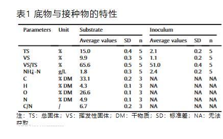 雞糞從北京一個蛋雞養(yǎng)殖場收集。作為投料前,糞便用自來水稀釋至總固體15%(w/w)后儲存在4°C房間中。接種物從先前研究中使用的中溫雞糞消化器中收集。投料和接種物的特性如表1所示。