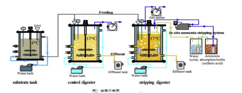 運行了兩個并行的中溫厭氧消化器,用于雞糞的高固體(基于總固體15%)消化。在圖1中,剝離消化器配備了原位氨氣剝離系統(tǒng),而對照消化器沒有。每個消化器有效容積為12 L,它們通過機械連續(xù)攪拌,轉(zhuǎn)速為100 rpm。溫度通過水浴循環(huán)維持在37°C。原位氨氣剝離系統(tǒng)包括一個帶時間控制器的真空泵、一個裝有800 ml 5 M硫酸的氨吸收瓶和一個裝有800 ml水的水瓶。后一個瓶用于防止硫酸逃逸到消化器。