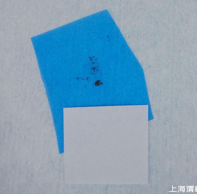 首先,使用藍(lán)膠(透明膠帶的一種,黏性弱但是更加干凈)粘附少許石墨烯樣品,用藍(lán)膠對(duì)粘數(shù)次之后藍(lán)膠表面的樣品慢慢就比較薄了,在樣品數(shù)量達(dá)到不多不少的程度的時(shí)候(見圖2),就可以進(jìn)行下一步的操作了。