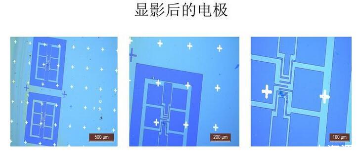 掩膜板是一塊玻璃,上面鍍有反射層,而制作電極的地方(即光刻圖案)沒有反射層。將掩膜板上光刻圖案剛好對(duì)準(zhǔn)在石墨烯上之后,就可以進(jìn)行曝光操作。曝光之后就是顯影,掩膜板上電極所在區(qū)域的膠都會(huì)消失,就好像凹下去了一樣,空出來(lái)的部分就用以放置電極(見圖6)。