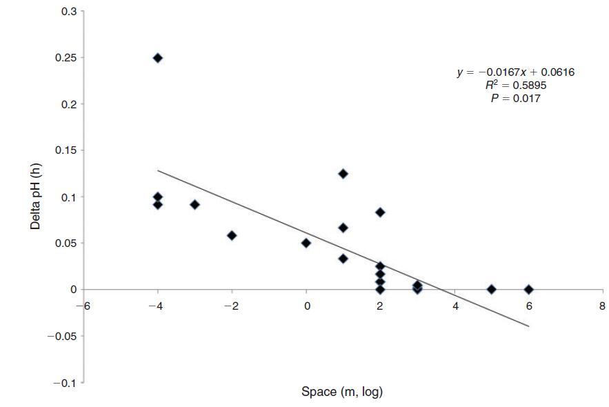 鑒于較大水體的慣性越來越大,我們預(yù)計生物波動的幅度與空間尺度成反比。珊瑚礁等沿海棲息地的生物碳酸鹽化學(xué)波動幅度確實與水柱大小和水交換率成反比(Bates和Leone 2001)。例如,Ohde和van Woesik(1999年)在沖繩島(日本)附近環(huán)礁的橫斷面研究中發(fā)現(xiàn),環(huán)礁中心最淺的區(qū)域(礁坪)的最大晝夜振幅為927米。潮汐池的水柱高度和交換率降低,是生物活動產(chǎn)生特別強烈的碳酸鹽化學(xué)變化的棲息地,波動幅度隨著海岸高度的增加而增加(Daniel和Boyden 1975)。迄今為止,生物源pH值波動的最大振幅記錄在非常小的尺度上(即在亞毫米尺度的底棲邊界層中)(Spilling等人2010;Hurd和Pilditch 2011;以及上面給出的例子)。pH值波動的空間尺度、頻率和幅度之間的反比關(guān)系如圖3所示。由于較小的水體具有較小的慣性,因此尺度和變化率不是獨立的。事實上,pH變化率與所考慮的空間尺度呈負相關(guān)(圖4)。最慢的變化發(fā)生在公海,在沿海棲息地觀察到快速變化,最劇烈的pH值波動來自藻類表面邊界層中亞厘米甚至亞毫米的“納米棲息地”(Spilling等人,2010年;Cornwall等人)2013年)。在開闊的海洋中,浮游生物斑塊(Schulz和Riebesell 2013)發(fā)生幅度小得多的晝夜和季節(jié)性波動,在這種情況下,可以將其視為漂浮的微生境。