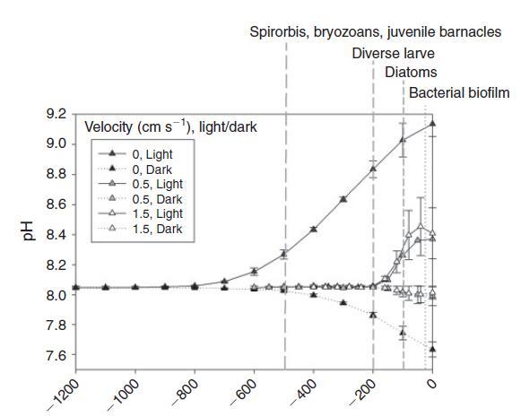 圖2.棕色巨藻Fucus vesiculosus葉狀體上具有擴散邊界層的pH梯度。在測量前5分鐘內(nèi),允許在明暗條件下以各種體積速度建立擴散邊界層。葉綠體表面位于距離=0處,即位于圖的右邊界處。垂直線描繪了大型藻類葉狀體表面(“0厘米”)上方的地層的外部界限,不同的表生生物通常生活在其中。