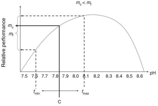 圖5.Jensen不等式說明當(dāng)環(huán)境變量和生物體性能之間的關(guān)系是非線性時,相同平均值的恒定(c)和波動(f)狀態(tài)可能會產(chǎn)生不同的響應(yīng)。因此,圍繞驅(qū)動器平均值(c)的對稱波動(在fmin和fmax之間)(本例中為pH值)可能會導(dǎo)致對恒定pH值的平均響應(yīng)(mc)周圍的不對稱響應(yīng)分布(mf),因此,降低目標(biāo)物種的性能(mf,mc)。