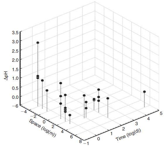 圖3.pH波動的典型振幅('delta pH')和頻率('Time')與所考慮系統(tǒng)的估計大小('Space')之間的關(guān)系。數(shù)據(jù)是從報告原位波動的選定論文中提取的(Morris和Taylor 1983;Middelboe和Hansen 2007;Semesi等,2009;Spilling等,2010;Thomsen等,2010;Hofmann等,2011;Hurd和Pilditch);Frieder et al.2012;Gray et al.2012;Price et al.2012;Cornwall et al.2013;Johnson et al.2013;Melzner et al.2013;Saderne et al.2013;Saderne and Wahl Stock et al.2013;al.2013;Comeau et al.2014;Hendriks et al.2014)以及本文中作者自己的測量結(jié)果。需要注意的是,這些文章中的幅度、時間和空間尺度是根據(jù)這些文章中的圖形和文本信息估算的,僅代表數(shù)量級。