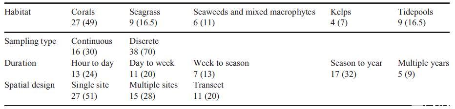 表1.碳酸鹽系統(tǒng)自然波動的原位研究數(shù)量數(shù)據(jù)基于54篇出版物(見表S2)。括號中的數(shù)字是百分比
