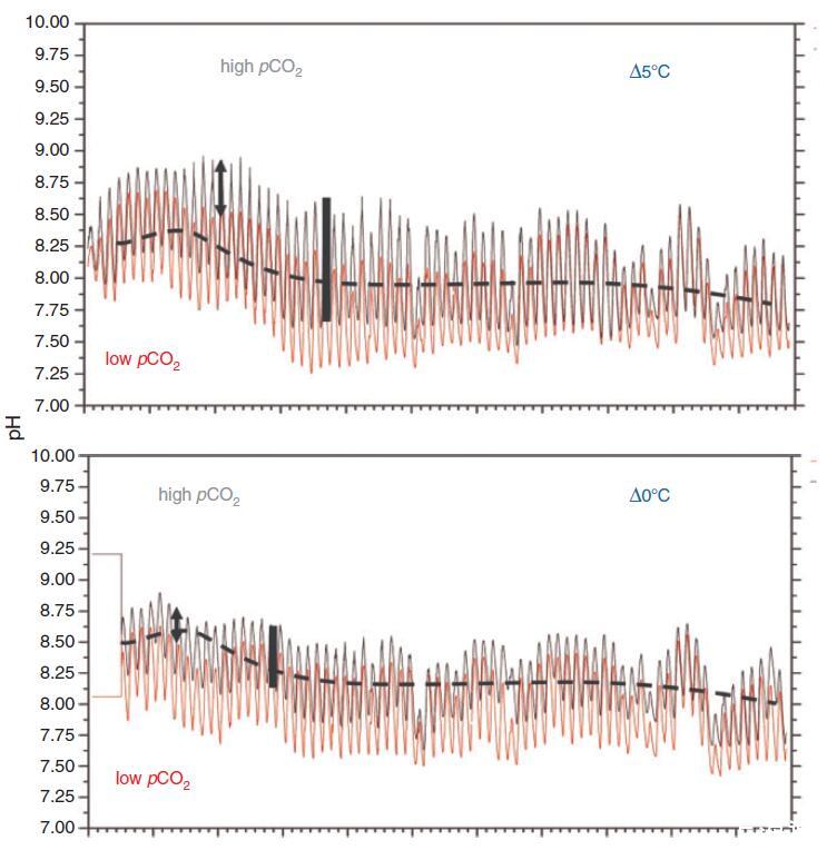 圖 6. Kiel Benthocosms:在兩種溫度狀態(tài)(環(huán)境為 D08,溫暖或“未來”為 Dt58C)和兩種酸化狀態(tài)(低 pCO2 或“環(huán)境”在 400 matm(淺灰色下曲線)下的波動 Delta pH 處理;底棲動物帶帽頂空處的高 pCO2 或“未來”為 1100 matm(深灰色上部曲線))。 快速振蕩(由垂直黑線表示的高 pCO2 狀態(tài)的振幅)是生物信號,可歸因于底棲動物群落光合作用和呼吸的晝夜節(jié)律變化。 黑色虛線表示基爾峽灣 pH 值的季節(jié)性下降。 雙頭箭頭表示頂空 pCO2 處理對底棲動物 pH 值的影響。 盡管在頂部空間空氣的 pCO2 增強中應用了相同的處理強度,但這意味著較低溫度下的 pH 值差異較小。 pH 值的生物源晝夜波動在較冷的區(qū)域也具有較小的幅度。