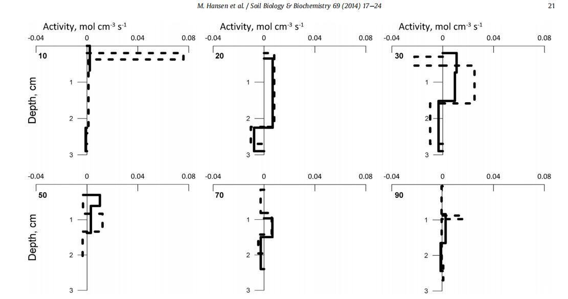 圖 2. TC 處理在 6 個(gè)時(shí)間間隔內(nèi)(洪水后 10、20、30、50、70 和 90 小時(shí))的 N2O 生產(chǎn)(正值)和消耗(負(fù)值)的模擬活動(dòng) (實(shí)線(xiàn))和TN(虛線(xiàn))。 < 0.0007 mol cm 3 s 1 的值未顯示。 對(duì)于治療 TL 和 TLN,參見(jiàn) SI 圖 S7。