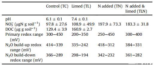 表格1 土壤 pH、NO3 和 DOC 濃度以及絕對(duì)值和絕對(duì)值的概述 主要氧化還原范圍和“積聚”和“積聚”階段的氧化還原范圍 所有四種處理的 N2O (n = 3)。