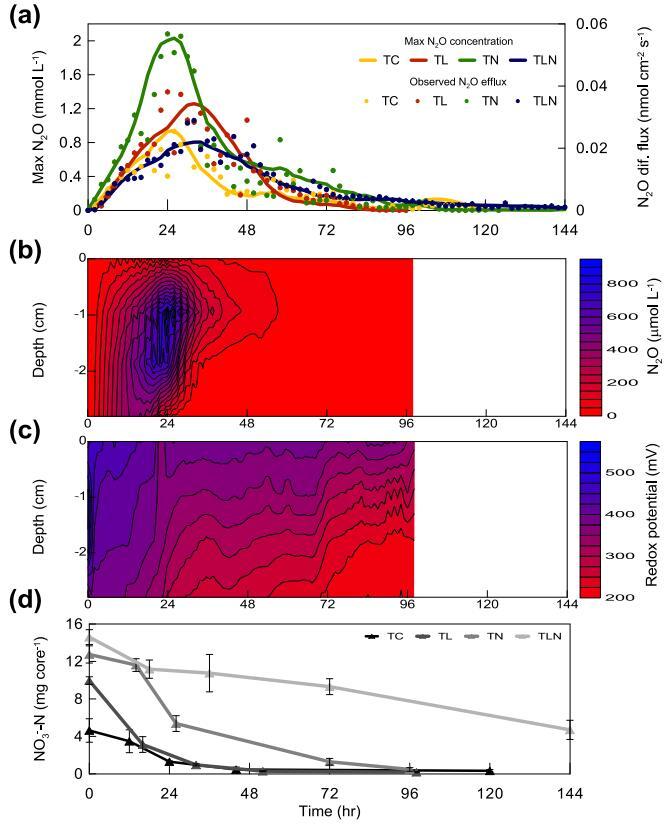 由于洪水,土壤氧化還原電位隨著時(shí)間的推移而降低,降低的速度隨著土壤深度的增加而增加(圖 1c 和 SI 圖 S5)。 這種深度驅(qū)動(dòng)的氧化還原電位變化主要發(fā)生在洪水的前 16 小時(shí)之后。 表 1 中可以看到每種處理的主要氧化還原范圍,其中 N2O 在土壤中積累。 TC、TN 和 TLN 處理的氧化還原范圍為 100 mV降低。 N2O 濃度和氧化還原電位顯著 (*P < 0.05) 相關(guān)(表 1),因?yàn)?N2O 濃度隨時(shí)間描繪了一個(gè)鐘形曲線(xiàn),氧化還原電位降低,其中“積聚”和“積聚”下降階段圍繞最大 N2O 濃度的出現(xiàn)進(jìn)行劃分(參見(jiàn) SI 圖 S6)。