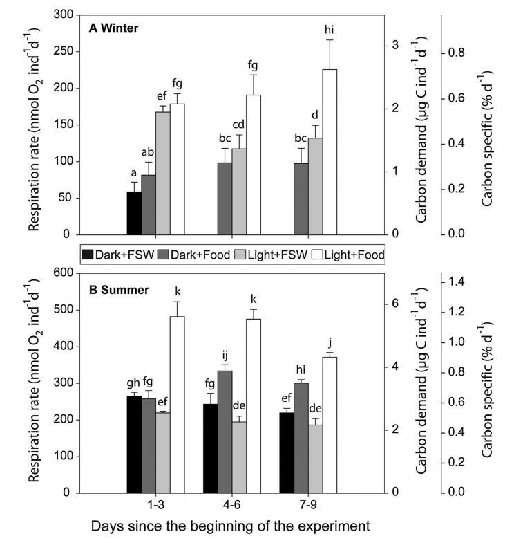 圖 2 呼吸速率,碳 每個人的需求率, 和碳特定需求 天 (nmol O2 ind-1 day-1, lg C ind-1 day-1 和 % day-1 分別)和標準 每次處理的偏差, 黑暗和過濾的海水 (黑暗+FSW),黑暗和食物 加成(暗+食物),光 暴露和過濾海水 (Light+FSW) 和 Light and 食物添加 (Light+Food),對于 一個冬天和一個夏天。 因為 技術問題,沒有結果 可用于第 4-9 天 Dark+FSW 中的治療 十一月。 對于所有碳特定需求結果, 不同的字母表示 之間的顯著差異 處理(單向方差分析, 迷幻劑; p \0.05)。 請注意 每個不同的 y 軸比例 季節
