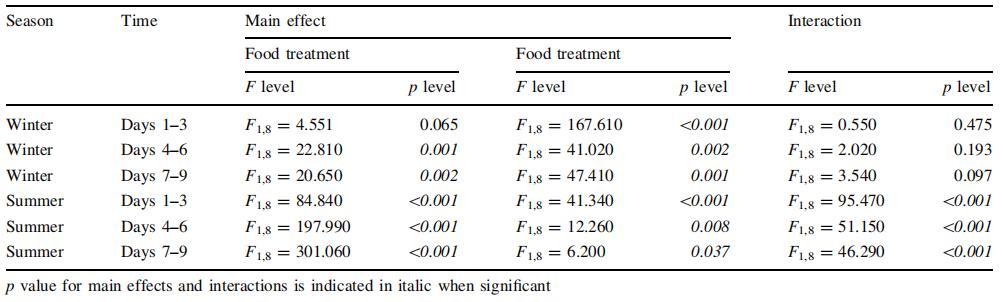 表 1 每個時間間隔的 C 特定需求率的雙向 ANOVA,包括食物處理 (Food/FSW) 和光照狀態 (Light/FSW) 暗)為主要因素