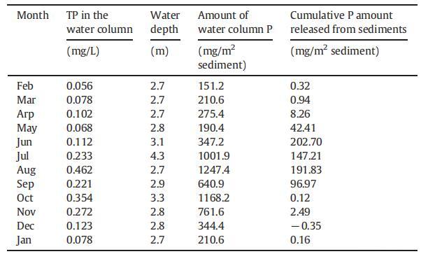 在本研究中,通過將SRP的擴散通量乘以月份內的天數,計算每個月每單位沉積物面積(m2)的P的內部負荷質量。還通過將TP濃度乘以水柱總深度,計算了每個月每單位沉積物面積(m2)水柱中TP的總質量,結果見表4。每平方米水柱中的TP含量從2月的151.2 mg/m2增加到2016年8月的1242 mg/m2。2月至8月(開花前)水柱中總磷的總增加量為1091 mg/m2,而磷的內部負荷質量范圍為2月的0.32 mg/m2至6月的202.7 mg/m2。2月至8月,磷的總釋放量為593.6 mg/m2,占開花前水柱中觀察到的總磷增加量的54%。