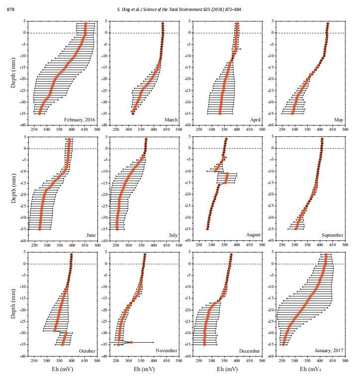 圖4。2016年2月至2017年1月期間每個月沉積物水剖面中Eh的垂直變化。數值為三次重復分析的平均值±標準差。