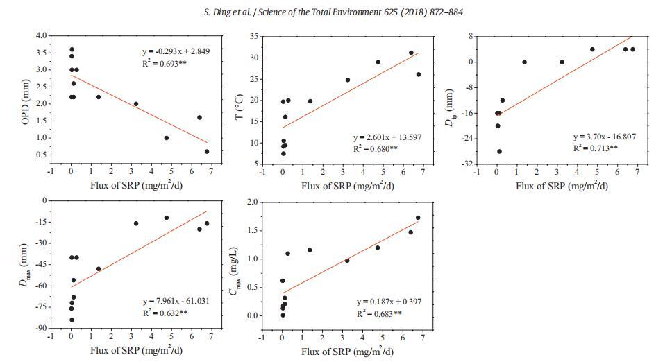 圖7顯示了每個月SWI的SRP通量,范圍從?12月為0.01 mg/m2/d,6月為6.76 mg/m2/d(負號表示向下通量)。從2月到7月,通量呈上升趨勢,并在8月之前保持在較高水平(4.75–6.76 mg/m2/d),隨后在2016年12月之前有所下降。最大正通量出現在6月,比10月的最小正通量高337倍。發現SRP通量與OPD、溫度和移動P的三個剖面特征參數(Dip、Dmax和Cmax)呈線性相關(圖8)。