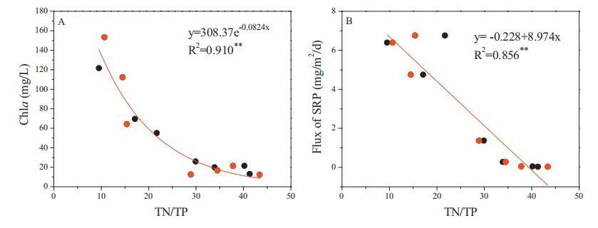 圖9。2015年2月至2017年1月太湖梅梁灣葉綠素濃度與TN/TP比值(A)和SRP通量與TN/TP比值(B)的關系。紅點和黑點分別顯示了2015年2月至2016年1月和2016年2月至2017年1月的數據。(關于本圖例中顏色的說明,讀者可參考本文的網絡版。)