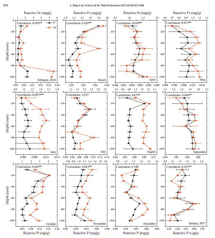 圖2。沉積物芯中活性磷和鐵濃度的垂直分布,每月從梅梁灣取樣,間隔10mm。結果表明,活性磷和鐵濃度之間存在相關性,在0.05水平下,顯著相關性用*表示,在0.01水平下,顯著相關性用**表示。數值為三次重復分析的平均值±標準差。