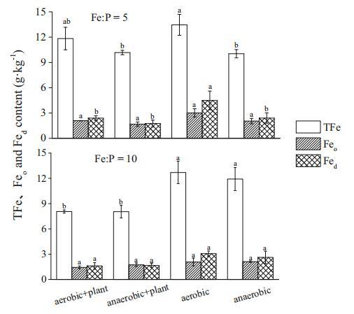 圖3兩種鐵磷比下四種處理(好氧+植物、厭氧+植物、好氧和厭氧)的總鐵(TFe)、無定形鐵(Feo)和游離鐵(Fed)含量