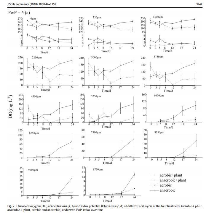 3.2不同鐵磷比下土壤元素的積累特征DO濃度分為三類:0-1500、2250-5250和≥6000,不考慮Fe/P(圖2a,b)。當(dāng)深度小于1500μm時,所有四種處理的DO濃度都是穩(wěn)定的。由于氧氣的引入,有氧組保持較高的DO濃度,其他兩組在4 mg L左右波動?1因為氮氣的引入。在2250和5250μm之間的深度,溶解氧濃度隨波動而增加。深度大于6000μm時,溶解氧濃度達到極限值(0.3 mg L?1),但在有氧條件下第12天后增加,表明深層土壤中的DO濃度降低,但隨著時間的推移迅速增加。土壤Eh值在兩種不同的鐵磷比之間差異很大。鐵磷比為5時,不同處理的土壤Eh值不同(圖2c)。好氧+植物處理的土壤Eh值向上波動,而厭氧+植物處理的土壤Eh值降至最低(第5天),然后緩慢上升,而對照處理的土壤Eh值則波動并下降。在鐵磷比為10的情況下,土壤Eh值通常先降低后升高(圖2d)。