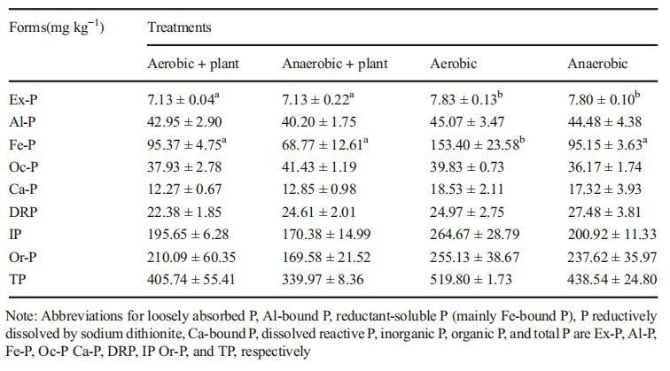 環(huán)境因子(DO和Eh)的變化影響土壤元素的積累。土壤磷形態(tài)的含量見表2和表3。小興凱湖濕地土壤有機磷和有機磷含量分別占總磷含量的50%左右。不同IP組分的減少順序為Fe-P>Al-P>Oc-P>Ca-P>Ex-P。不同處理之間的Fe-P、Ex-P或Al-P含量存在顯著差異,但Oc-P、Ca-P和DRP沒有顯著差異(表2和表3)。此外,我們還發(fā)現(xiàn),在四種處理中,有氧條件下的磷形態(tài)含量最高。