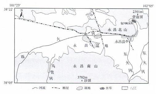 河西走廊西大河流域的永昌盆地介于永昌南山與永昌北山之間(下圖),海拔1875~2106m,地勢自西南向東北傾斜。盆地內(nèi)分布有若千塊濕地,這些濕地的形成是地形、地質(zhì)條件及地表水、地下水共同作用的結(jié)果。金川峽水庫位于盆地最低處,是當(dāng)?shù)厣a(chǎn)和生活的重要水源地。