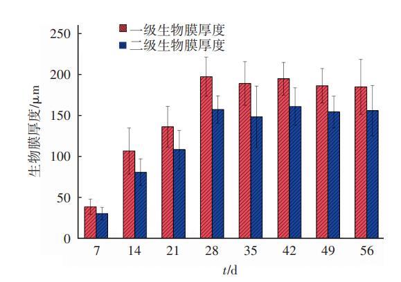一、二級懸浮載體的生物膜厚度變化如圖7所示。生物膜厚度與生物量的變化趨勢較為一致,當運行14 d系統硝化負荷穩(wěn)定后,一、二級懸浮載體的生物膜厚度分別為(107±28)、(81±16)μm;此后,隨著運行時間的延長,生物膜厚度繼續(xù)增長;28 d后分別穩(wěn)定在(197±23)、(157±17)μm。